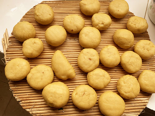 像包饺子一样往里放红糖,搓圆。