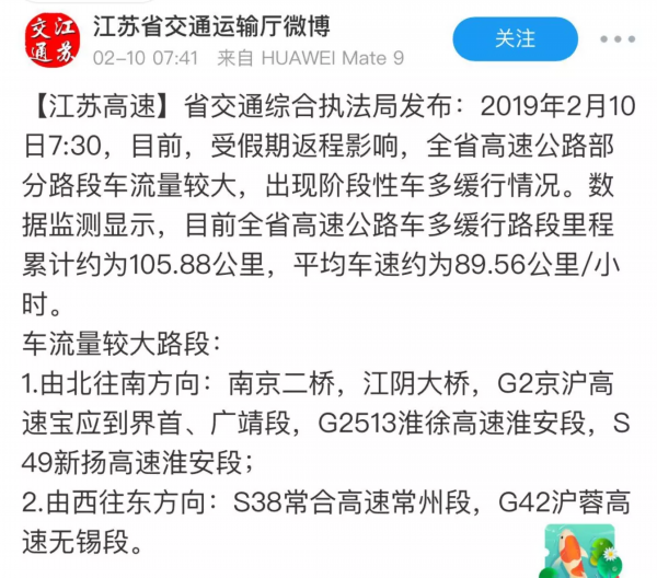 针对以往春运返程通行情况,江苏交警提醒广大驾驶人合理规划线路,错时错峰返程,注意避开易拥堵路段。