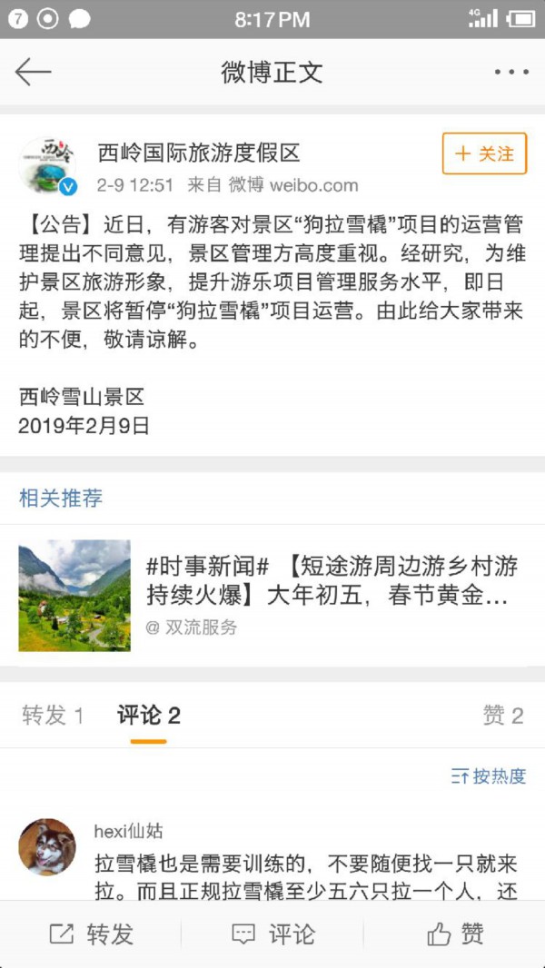 2月9日中午,成都文化旅游发展股份有限公司西岭雪山运营分公司官方微博“西岭国际旅游度假区”发出公告。公告写到:“近日,有游客对景区‘狗拉雪橇’项目的运营管理提出不同意见,景区管理方高度重视。经研究,为维护景区旅游形象,提升游乐项目管理服务水平,即日起,景区将暂停‘狗拉雪橇’项目运营。”
