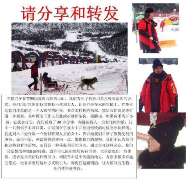 制作图片的游客留下了数百字的配文,文中称,春节期间他们在西岭雪山参观时,看见了景区用狗拉雪橇的方式吸引游客。首先引起他们注意的,是一个人在乘坐雪橇时,多次击打狗的头部,其中两名工作人员继续折磨那条狗,威胁说如果狗不离开小路就会打它。