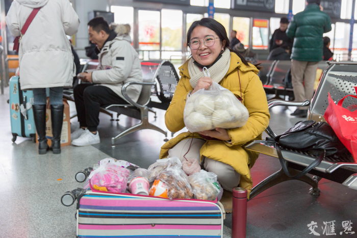 10日,如皋汽车站候车大厅,大批旅客结束春节假期踏上返程旅途。他们的行李箱里装满了各种土特产,带着家人的牵挂与祝福走上各自的工作岗位。图为23岁的徐相琴带着妈妈为她准备的家乡的馒头、春卷、咸鱼等包裹,准备返回工作地上海。