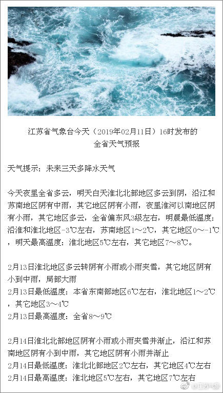 据江苏省气象台,今天(11日)夜里全省多云,明天白天淮北北部地区多云到阴,沿江和苏南地区阴有中雨,其它地区阴有小雨,夜里淮河以南地区阴有小雨,其它地区多云,全省偏东风3级左右,明晨最低温度:沿淮和淮北地区-3℃左右,苏南地区1~2℃,其它地区0~-1℃,明天最高温度:淮北地区5℃左右,其它地区7~8℃。详情戳图↓↓↓