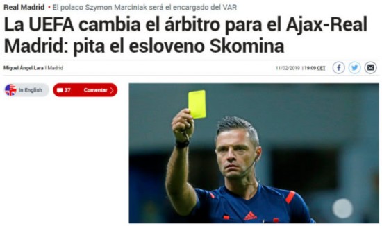 腾讯体育2月12日讯 据《马卡报》报道,欧冠1/8决赛首回合,阿贾克斯vs皇马的比赛,裁判发生了变化。原定的主裁判马齐尼亚克将成为VAR裁判,主裁将由斯科米纳担任。【】