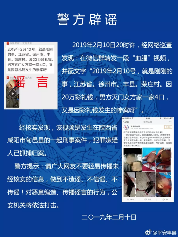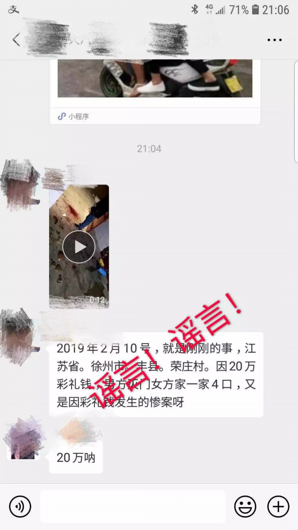 2月10日下午,一条信息在徐州人朋友圈内广泛传播,文字内容为“2019年2月10号,就是刚刚的事,江苏省。徐州市。丰县。荣庄村。因20万彩礼钱,男方灭门女方家一家4口,又是因彩礼钱发生的惨案呀”,并配有一段“血腥”视频。