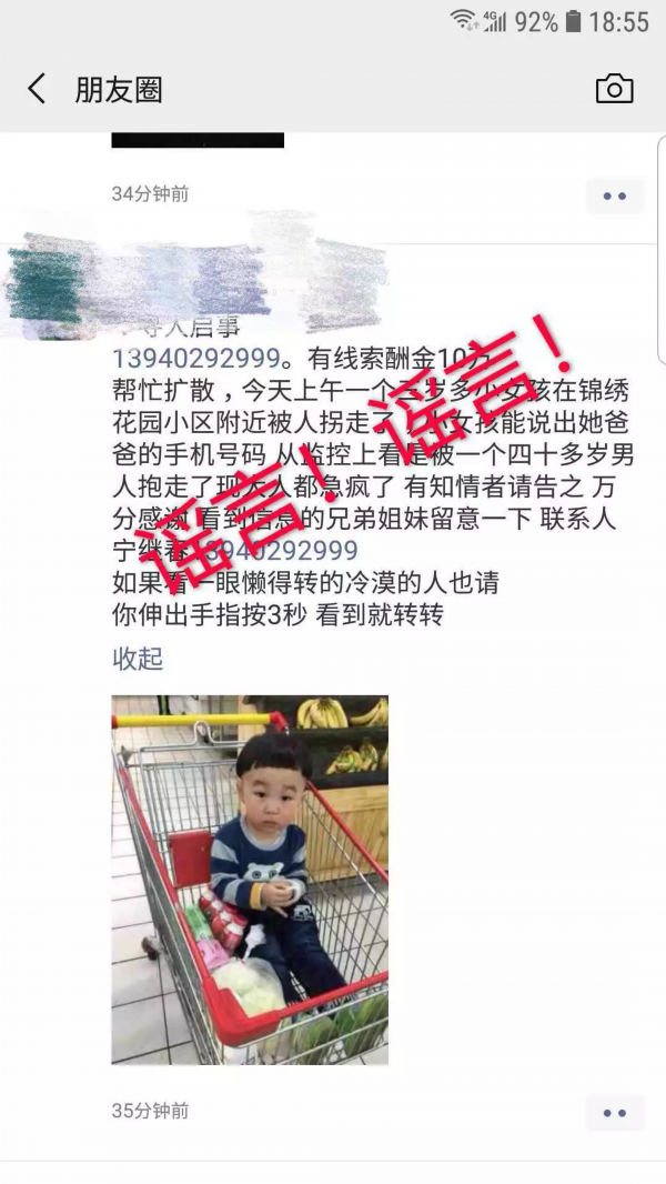此类谣言不指明具体的事件发生时间、城市,并附上“重金酬谢”的字样来吸人眼球,具有较强的迷惑性,这正是此类谣言得以在全市甚至全国范围内大肆传播的原因。
