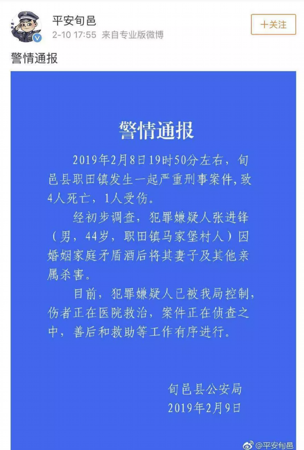 丰县公安局网警巡查发现后,经过核实,确认视频内容实为2月8日发生在陕西省咸阳市旬邑县的一起刑事案件,犯罪嫌疑人已被抓捕归案,旬邑县公安局已对该案件进行通报。