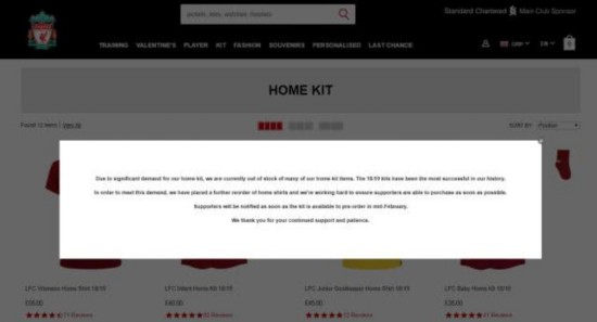 球队状态出色,最开心的自然是利物浦球迷了,向来以狂热著称的红军球迷也没有吝惜自己的支票本,他们不但每场比赛将安菲尔德球场填的满满的,而且还把本赛季利物浦的主场球衣抢购一空。目前在利物浦官方网站上,我们已经无法买到红军的主场球衣了。