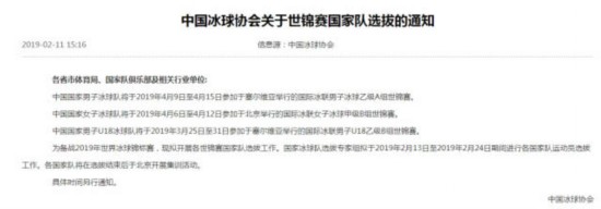 2月12日,中国冰球协会官网发布《中国冰球协会关于世锦赛国家队选拔的通知》,通知中表示,为了备战2019世界冰球锦标赛,国家冰球队选拔专家组拟于2019年2月13日至2019年2月24日期间进行各国家队运动员选拔工作。各国家队将在选拔结束后于北京开展集训活动。