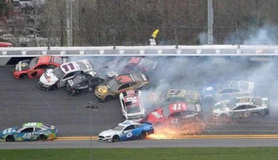 后面的车辆有的打滑,有的撞在一起,有多辆车的引擎盖被掀开,车体受损严重,只能退出比赛。这起事故造成十多辆车撞成一团终止比赛,而赛道上只剩下7辆车在安全车的引导下继续比赛。