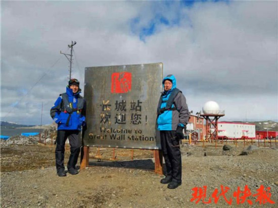 邱协耕(右)和儿子邱晓翔(左)登陆南极长城站。