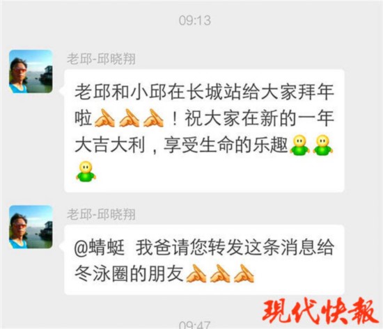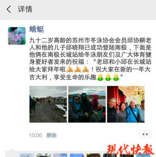 2月11日,现代快报记者联系上了苏州冬泳协会的副秘书长华意娟,她就是帮邱老代发朋友圈的好友。华意娟告诉记者,自己今年55岁,与邱老在冬泳时认识的,可谓“忘年之交”。“邱老非常热爱体育运动,并且十分坚持,30多年如一日,邱老也十分勤奋,自从能够上网写博客就一直坚持写到现在,笔耕不辍。”华意娟聊起她对邱老的印象。