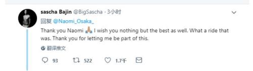 在大阪直美宣布结束合作的推特下面,萨沙·巴金回复到:“感谢你,直美。我同样祝愿你一切顺利。这是一段了不起的旅程,感谢你让我参与其中。”(完)