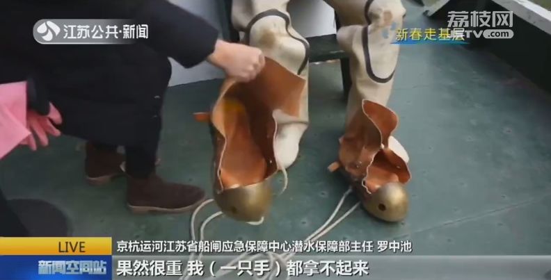 记者尝试提起潜水员专用的靴子,感觉真的很重。罗中池介绍,光是一只靴子的重量就有9公斤,两只靴子就有18公斤;整套潜水装备加起来有75公斤重!