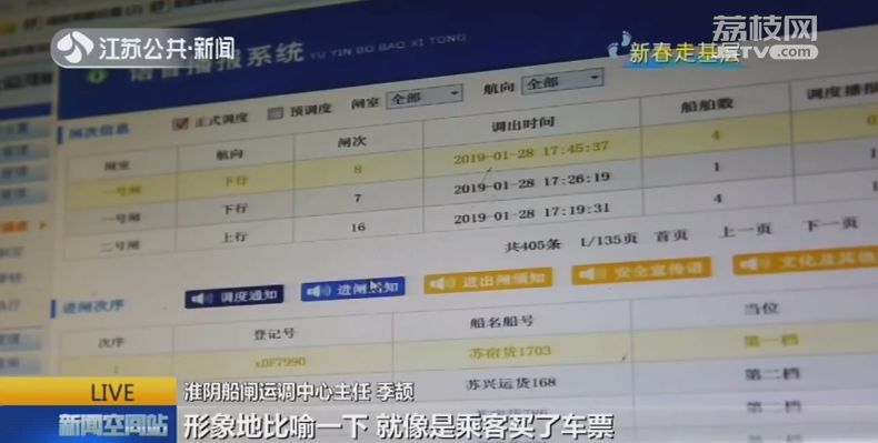 淮阴船闸运调中心主任季颉介绍,根据船舶的登记先后次序和船舶的大小尺寸,在电脑上自动进行排档。做一个形象的比喻,传播过闸,就像是乘客买车票,只不过车票是根据买票的先后顺序以及体重身型,安排好合适的座位,这样就进一步提升了船舶过闸的速度。