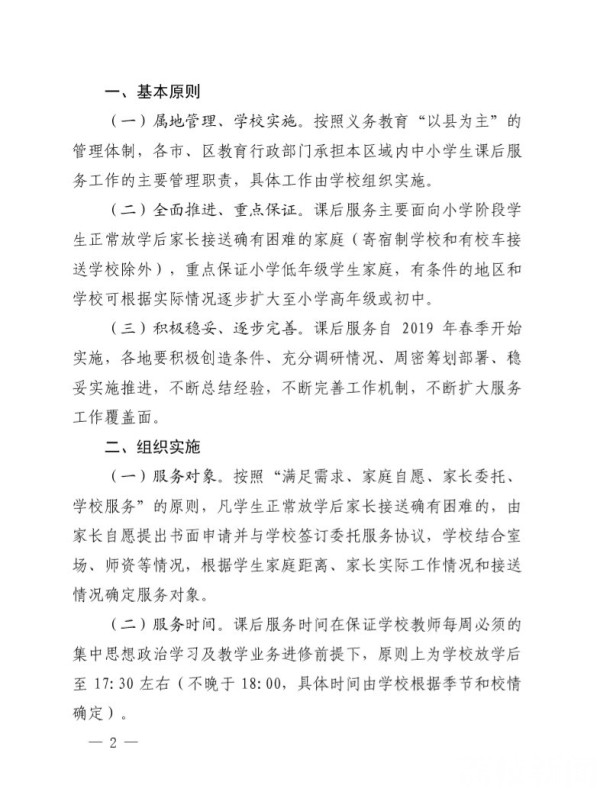 课后服务自2019年春季开始实施,各市、区在充分调研的基础上周密筹划部署、稳妥实施推进,不断扩大服务工作覆盖面。苏州市副市长曹后灵表示,《中小学生课后服务指导意见》按照“满足需求、家庭自愿、家长委托、学校服务”的原则,凡学生正常放学后家长接送确有困难的,可以由家长自愿提出书面申请,由学校根据场地、师资、学生家庭距离、家长实际工作情况和接送等情况确定服务对象。重点保证小学低年级阶段的学生,有条件的地区和学校可根据实际情况逐步扩大至其他年级:“关于服务时间,原则上为学校放学后至17:30左右(不晚于18:00,具体时间由学校根据季节和校情确定)。关于服务内容 采用线上线下相结合的方式,集中完成作业,组织自主阅读和学习交流,面向个别学生答疑辅导,根据学校特色开展各类活动等。”