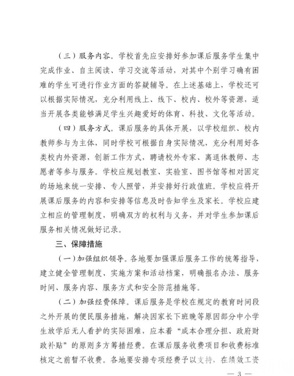 不少家长关心,课后服务工作会向学生收费吗?苏州市教育局副局长华意刚介绍,课后服务是学校在规定的教育时间段之外开展的便民服务措施,解决因家长下班晚等原因部分中小学生放学后无人看护的实际困难。关于经费保障,本着“成本合理分担、政府财政补贴”的原则多方筹措经费,“经审批学校可以向参加服务的学生家长收取部分费用,同时由各地发改、财政、人社安排专项经费予以支持。目前省、市相关部门正在开展收费项目申报工作,待批准后由各地执行。”