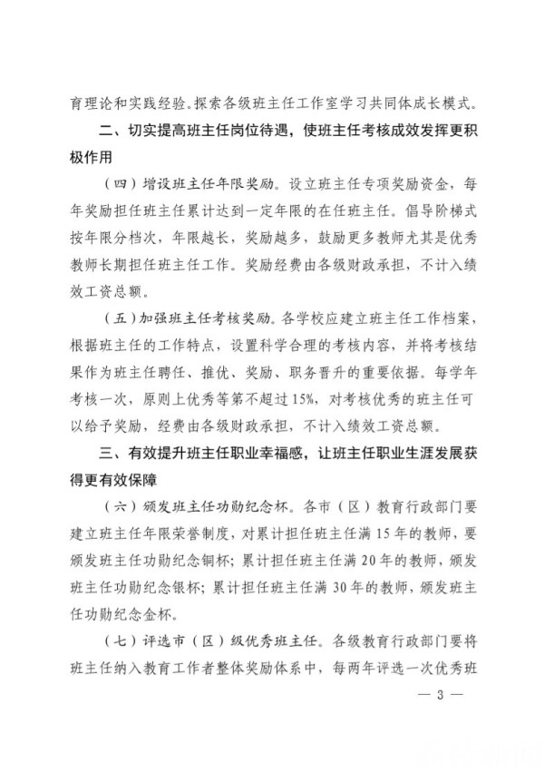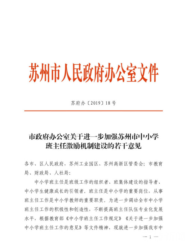 当天的发布会上,苏州市政府还发布了《进一步加强苏州市中小学班主任激励机制建设的若干意见》。意见提出将增设学校班主任专项奖励,实施精准激励。苏州市教育局副局长李婧娟:“根据《意见》的要求,增设了班主任年限奖励。把班主任工作年限奖分为‘10年以下’‘10-14年’‘15-19年’‘20-24年’‘25-29年’‘30年以上’六级,津贴逐级递增,分别为每月200元、300元、400元、500元、600元、1000元,重点奖励长期从事班主任工作的教师;同时增设优秀班主任奖,每年对考核为优秀的老师给予一次性奖励3000元,优秀比例约为班主任总量的15%。”