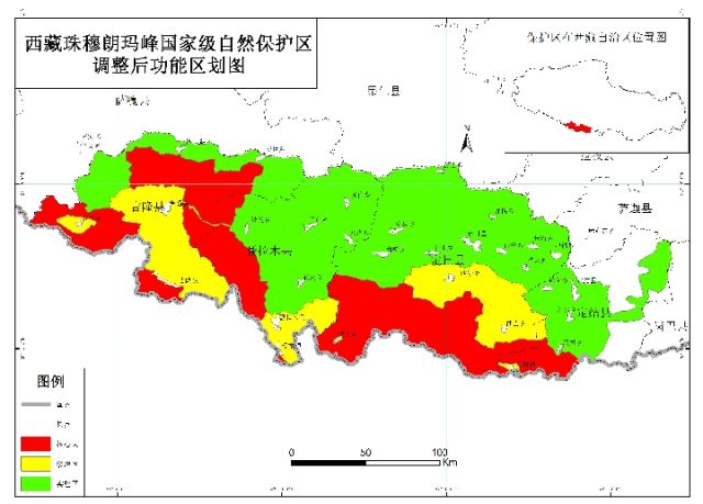 而珠峰景区只是珠峰保护区内的一小部分区域,入口位于定日县城西南方向约20公里处,范围与保护区实验区高度重合。据定日县珠峰管理分局提供的消息,在2018年的保护区功能分区调整中,从景区入口到绒布寺的道路及两侧100米内的范围均被划入实验区,2019年调整后的游客大本营也位于绒布寺一带的实验区内。根据《自然保护区条例》,实验区内可开展科学试验、教学实习、参观考察、旅游等活动。