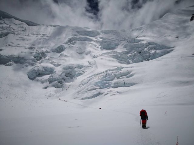 2018年春季珠峰登山季期间,登山者在珠峰上拉练。北大登山队供图。