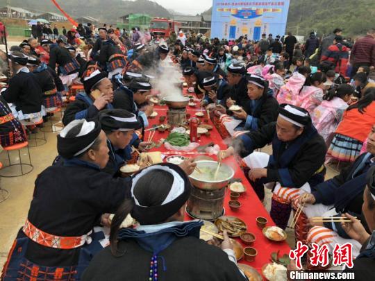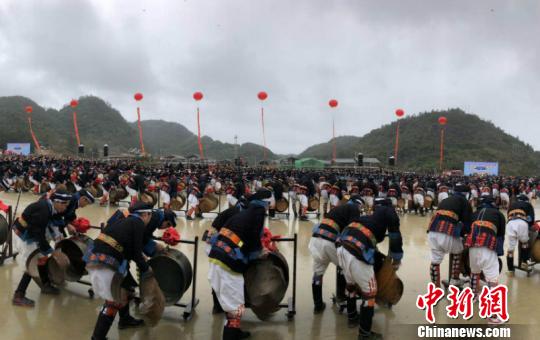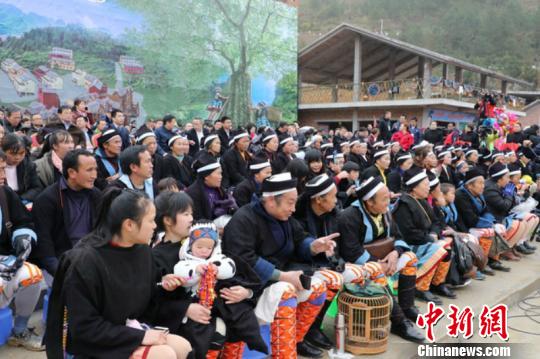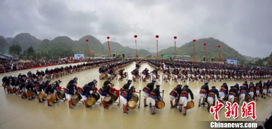 中新网河池2月16日电 (莫聪灵 林浩)2月16日,2019南丹·荔波白裤瑶年街节在广西河池南丹县开幕,2000多名白裤瑶群众身着盛装,欢聚“世界白裤瑶乡”核心景区——里湖瑶族乡,共同敲铜鼓、打陀螺、射驽箭,展示神秘的民俗文化。