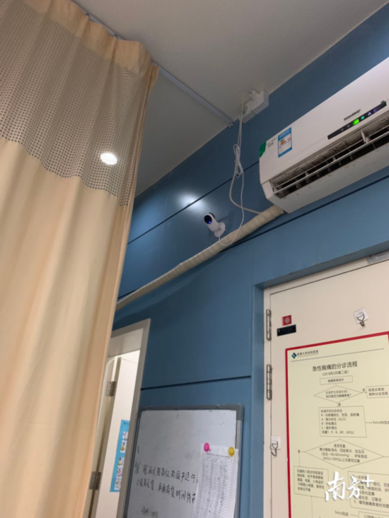 2月13日下午5点,市民赫小姐因发烧、心悸前往香港大学深圳医院就诊,在急诊科2号分流站做心电图检查时,赫小姐突然发现在墙面空调下方有一个闪烁蓝灯的监控探头正对着她的床位拍摄。