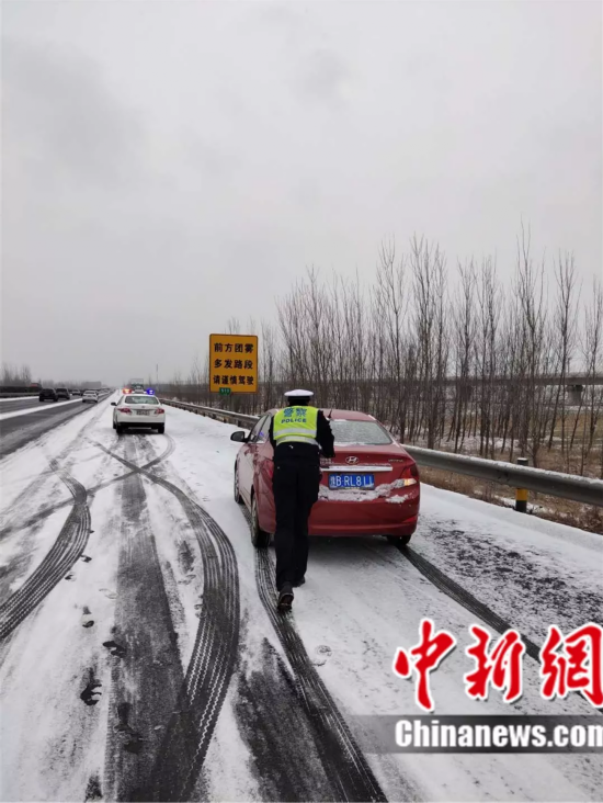 风雪返程路,交警推着打滑的车辆前行。 图片来源:河南省公安厅高速交警总队