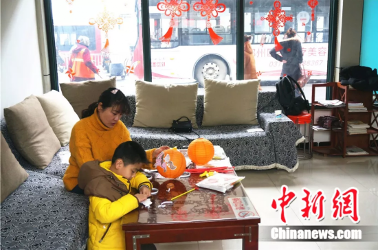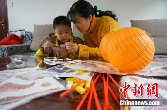 在妈妈的指导下,马天宇给灯笼贴粘贴画。 韩章云 摄