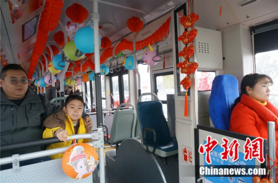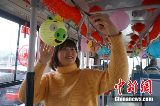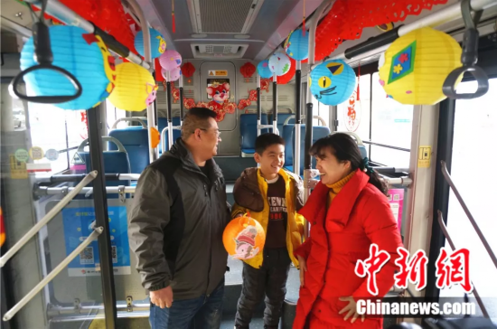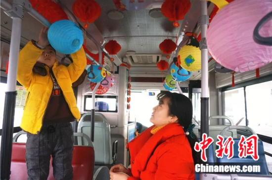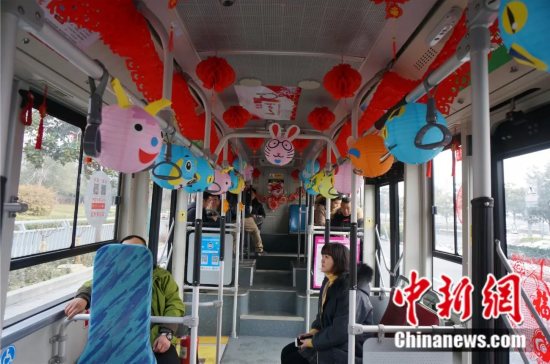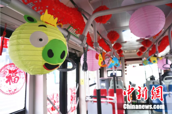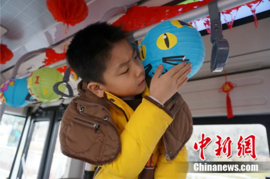纸灯笼装扮的公交车厢里,充满了童趣和节日气氛。韩章云 摄