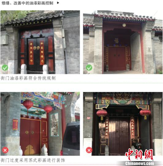 由北京市规划和自然资源委员会编制的《北京历史文化街区风貌保护与更新设计导则》已于日前开始公示。图为《导则》中采用大量图例解释相关规定,在推荐的图例方案上标示绿色“对勾”,对不恰当的图例方案上标示红色“错叉”,让人对“好坏对错”一目了然。北京市规划自然资源委供图