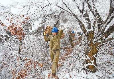 电力作业人员在运送物资上山。肖 强摄(人民视觉)
