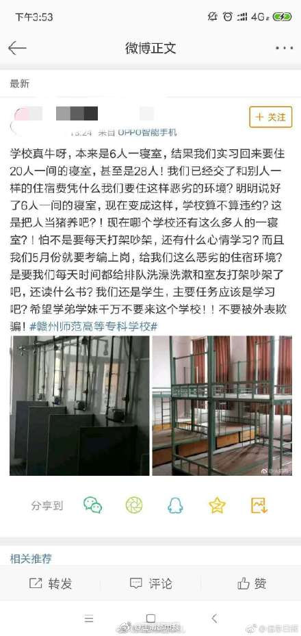 6人寝,8人寝,那你听说过28人寝吗?近日,网友爆料称:@赣州师范高等专科学校微校园 给即将毕业的返校学生安排28人“豪华大寝室”。学生认为该住宿环境太差劲,还调侃学校这是把学生当猪养呢。
