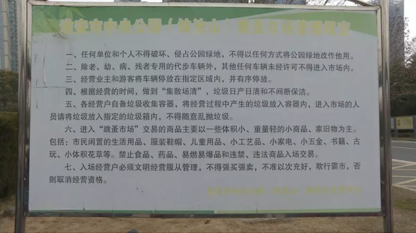在钵池山公园跳蚤市场,记者发现东侧入口处还立着“市场管理规定”的大牌子。其中第六条明确规定,进入市场的商品主要以旧物、闲置生活用品为主。不过,记者在走访时发现,现在大多数摆摊设点的都是小摊小贩,这给周边的环境卫生带来了不利的影响。