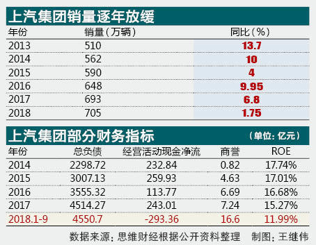 上汽集团宣称,营收增速放缓的最主要原因之一,是整车销量不及预期。业绩预告显示公司2018年度整车销量705.17万辆,同比增长1.75%。这一增速为公司近十年来销量的最低增速,同时公司全年汽车产量下滑0.14%。