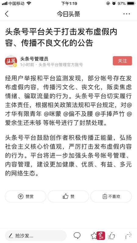 今日头条也表示了关闭原因是账号发布虚假内容,传播污文化、丧文化,贩卖焦虑情绪、骗取流量的行为。