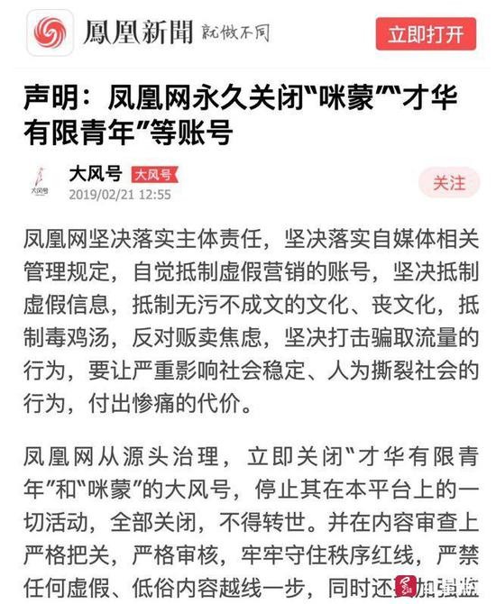 凤凰网声明中表示:自觉抵制虚假营销的账号,坚决抵制虚假信息,抵制无污不成文的文化、丧文化,抵制毒鸡汤,反对贩卖焦虑,坚决打击骗取流量的行为,要让严重影响社会稳定、人为撕裂社会的行为,付出惨痛的代价。凤凰网从源头治理,立即关闭“才华有限青年“和“咪蒙”的大风号,停止其在本平台上的一切活动,全部关闭,不得转世。