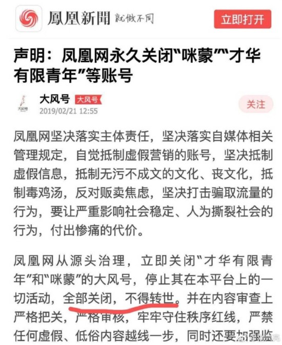 除此之外,咪蒙在头条号、凤凰网注册的账户均被注销。