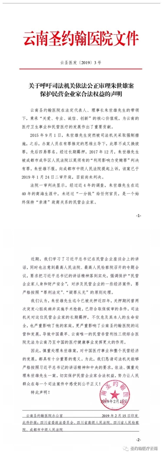 2019年2月16日,微信公号“圣约翰医疗云南”贴出一份名为《关于呼吁司法机关依法公正审理朱世雄案 保护民营企业合法权益的声明》的文件,其盖章为“云南圣约翰医院”,文末显示“此件抄报”四川省政法委、四川省高院、四川省检察院、成都中院四家单位。
