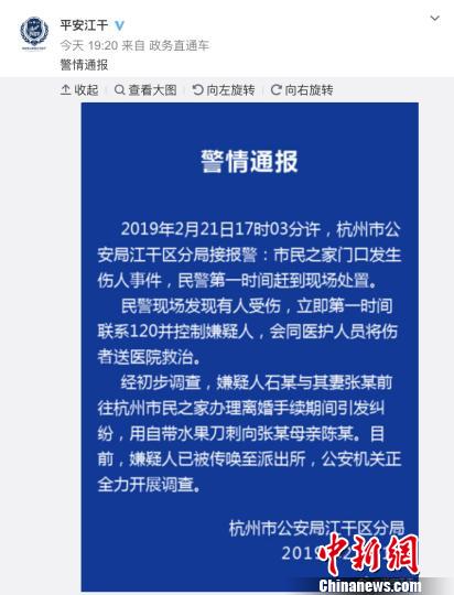 经警方初步调查,嫌疑人石某与其妻张某前往杭州市民之家办理离婚手续期间发生纠纷,用自带水果刀刺向张某的母亲陈某。目前,嫌疑人已被传唤至派出所,公安机关正全力展开调查。(完)