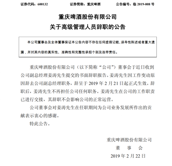 重庆啤酒公告显示,董事会近日收到公司副总经理姜涛提交的书面辞职报告,姜涛因工作变动辞去公司副总经理职务,辞呈于2019年2月21日起生效。辞职后,姜涛不再担任公司任何职务。姜涛在公司的工作职责已交接,其辞职不会影响公司正常运营。