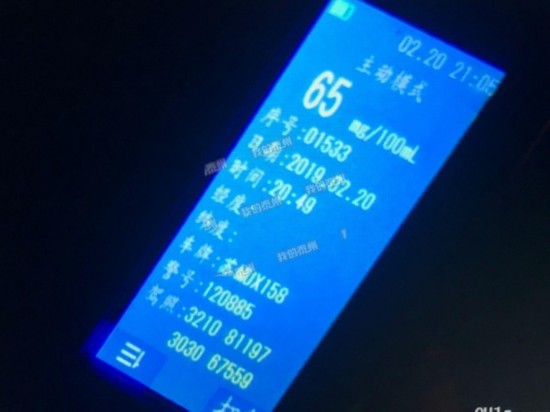 晚上八点五十左右,在东风路与永兴路交叉路口,民警发现,一辆白色本田车时快时慢,有掉头迹象,民警立即赶过去对该车进行拦截,发现车中散发有一股浓浓的酒味,遂对驾驶人季某进行呼气式酒精检测仪测试,检测结果为65mg/100mL,涉嫌饮酒后驾车。