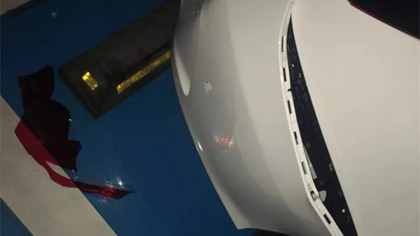 交警走近一看,发现奔驰右后角凹陷,金属板裂开了近3公分,排气管变形,上方裂开2个口子。而车左前方的柱子上有数条刮痕,地上都是白灰。▼