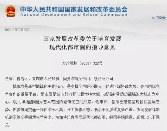 21日,国家发展改革委对外发布了关于培育发展现代化都市圈的指导意见。意见提出,到2022年,都市圈同城化取得明显进展,基础设施一体化程度大幅提高,阻碍生产要素自由流动的行政壁垒和体制机制障碍要基本消除。