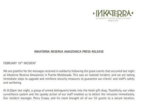 在今天早些时候发布的官方声明中,Inkaterra酒店就表示这是一起独立事件,并采取升级措施和加固安保来保证客户与员工的安全。