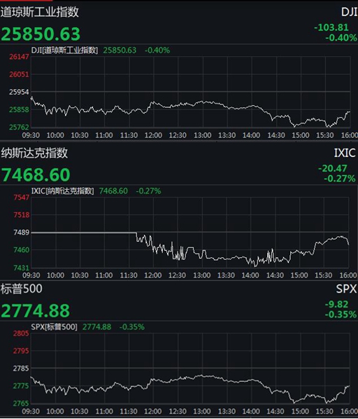 截至收盘,道琼斯工业平均指数收跌103.81点,跌幅0.40%,报25850.63点;纳斯达克综合指数收跌29.36点,跌幅0.39%,报7459.71点。标普500指数收跌9.82点,跌幅0.35%,报2774.88点。