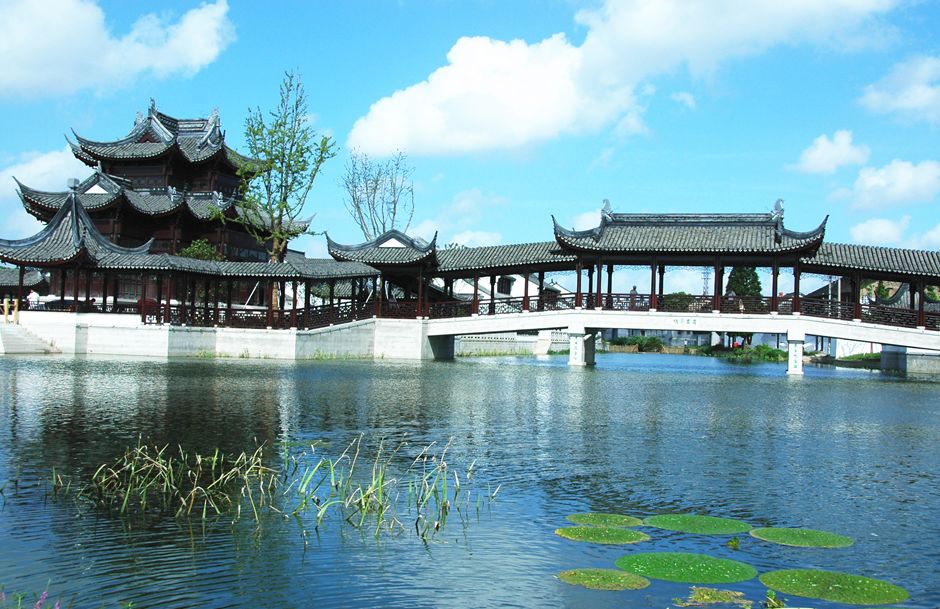 古镇活化石、文化新体验,文化园建有甪直水乡妇女服饰博物馆,甪直历史文物馆、盛唐甫里街、休闲水街、中心园林区、古戏台等景观。