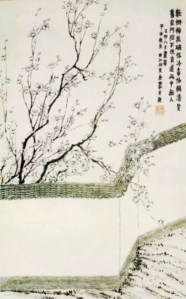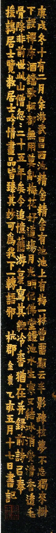 画跋:“庚戌冬十有二月,余游武昌西池精舍,精舍有池,池上有梅一林,曾留题云:半影疏枝梦不忘,独来树下设禅床,酒铛歌板都无用,莫乱梅花好道场,月光明侣佛堂灯,池水生寒又结冰,消受清香透毛骨,除非前世此山僧。忽忽二十五年矣,今追忆旧游复写其貌,冷香犹在。并录前诗,以奉援鹑居士览教,居士吟情画品皆臻妙,可为我下一转语邪。杭郡金农乙亥五月十七日书记。”