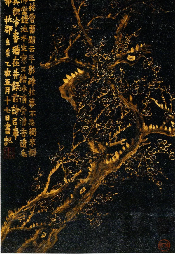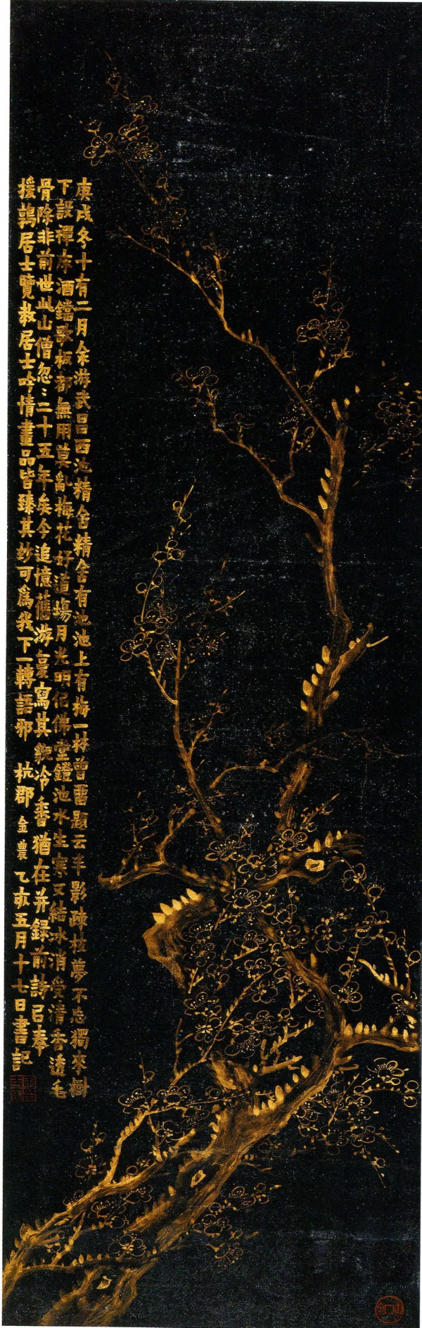 现藏于徐州博物馆内的《泥金梅花图轴》作于乾隆二十年(1755年),是金农晚年的作品。这幅《梅花图轴》用泥金画于磁青笺上,藏青色的笺纸和金色的字画,形成冷暖明暗的鲜明对比,整体高雅、华丽而有生气。