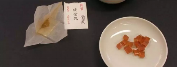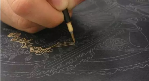 采用金箔加上适量的胶水加热后反复研磨而成。