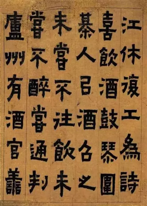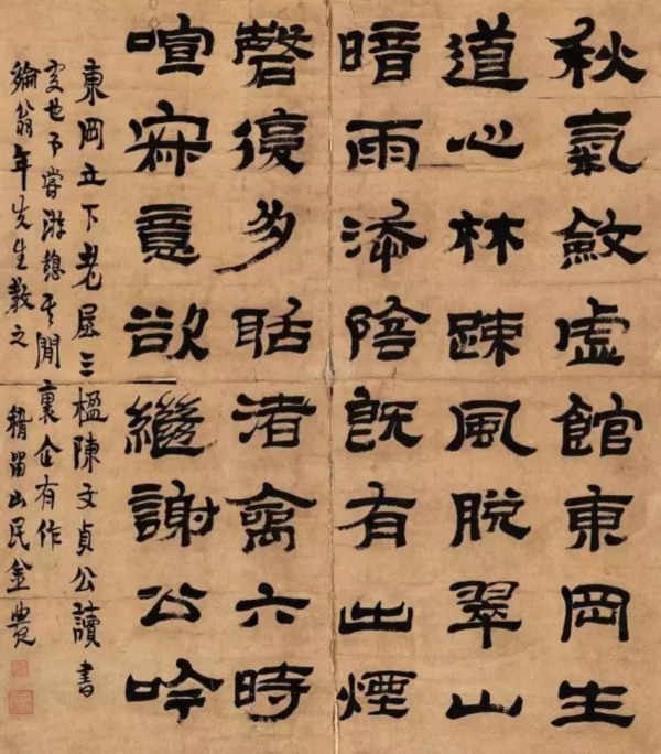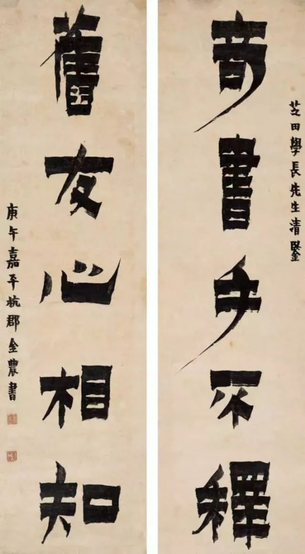 在画面的空白处,金农的款跋巧妙穿插,位置适宜,字体是他独创的隶书、楷书相结合的“漆书”,用平头毛笔刷出,横竖相同,棱角分明,排列规整,几乎是今天的美术字的前身,在整个构图中起到了平衡作用,使之与画面结合为和谐统一的整体。