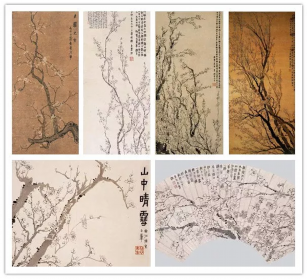 金农画花朵,采用双钩圈花法,画花蕾,则用浓笔在树干上加点。利用笔墨的浓淡交替,显示出疏密、虚实的关系。花朵的阴阳向背,肥瘦之分,或聚或散,都处理得生动自然,恰到好处,使每一株梅花都具有自然界的形态特征。